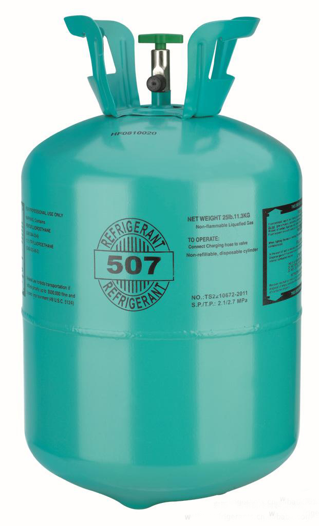 物化特性:R507是一种不含氯的共沸混合制冷剂,常温常压下为无色气体,贮存在钢瓶内是被压缩的液化气体。其ODP为0,因此R507是不破坏大气臭氧层的环保制冷剂。