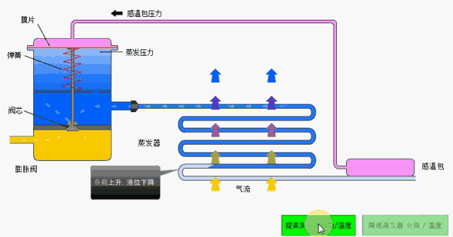 感温包内压力由毛细管传到膜片上部的空间,在压力的作用下膜片以弹性变形的方式把信号传递给顶针(执行机构),从而调节阀们的开度,控制制冷剂的流量。我们来看一个动图: