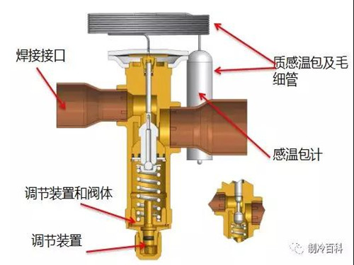 热力膨胀阀是制冷系统的重要自控元件,一般安装于储液筒和蒸发器之间。利用感温包的温度变化作为信号,调节阀开度,改变制冷剂流量,使中温高压的制冷剂通过其节流成为低温低压的湿蒸汽,然后制冷剂在蒸发器中吸收热量达到制冷效果。(来源:制冷快报/制冷百科)